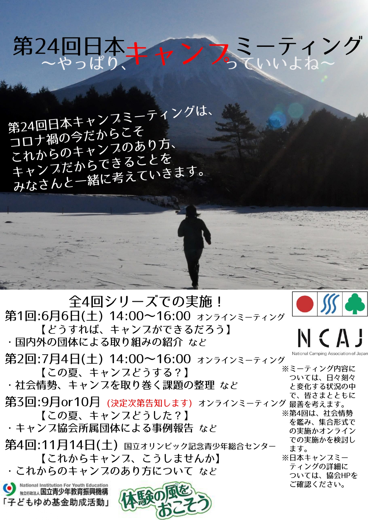 そこで、第24回日本キャンプミーティングは、6月から11月にかけてオンラインミーティングとリアルイベントを組み合わせて、4回にわたってキャンプにかかわる皆さんで集い、これからのキャンプのあり方、キャンプにできることを一緒に考えていきたいと思います。そして、最後にはみんなで「やっぱりキャンプっていいよね!」と再認識できるような機会にしたいと思っています。