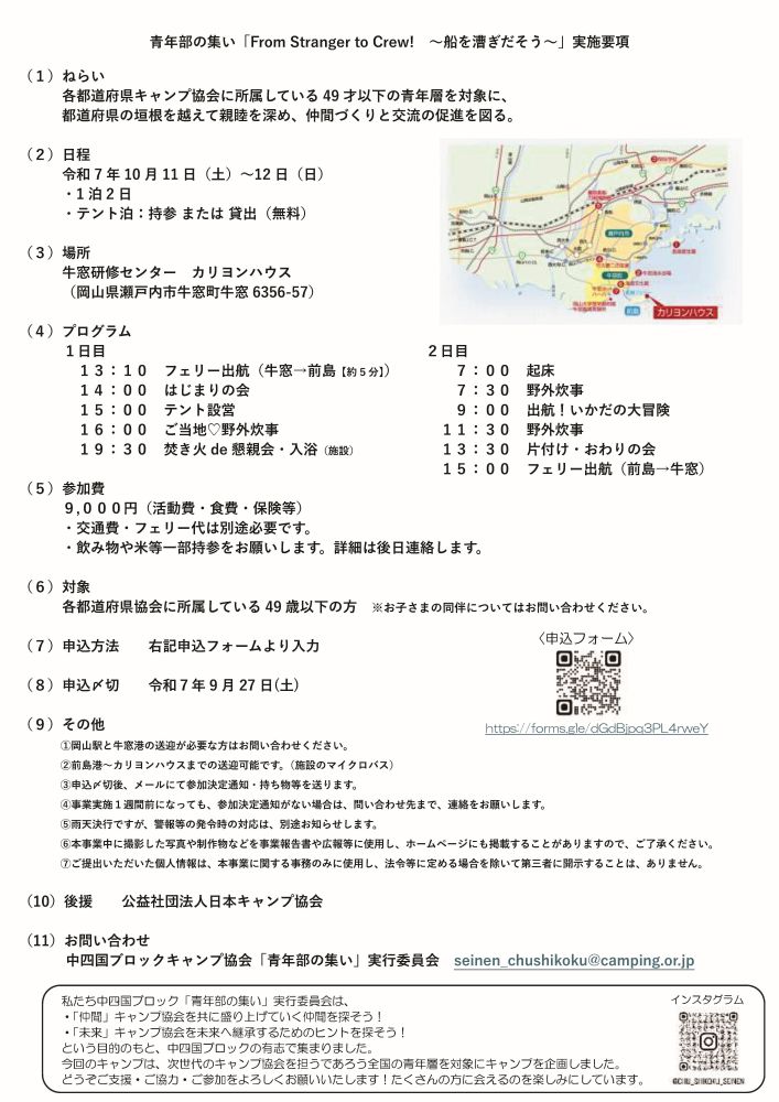 各都道府県キャンプ協会に所属している49歳以下の青年層を対象に、都道府県の垣根を越えて親睦を深め、仲間づくりと交流の促進を図る。
