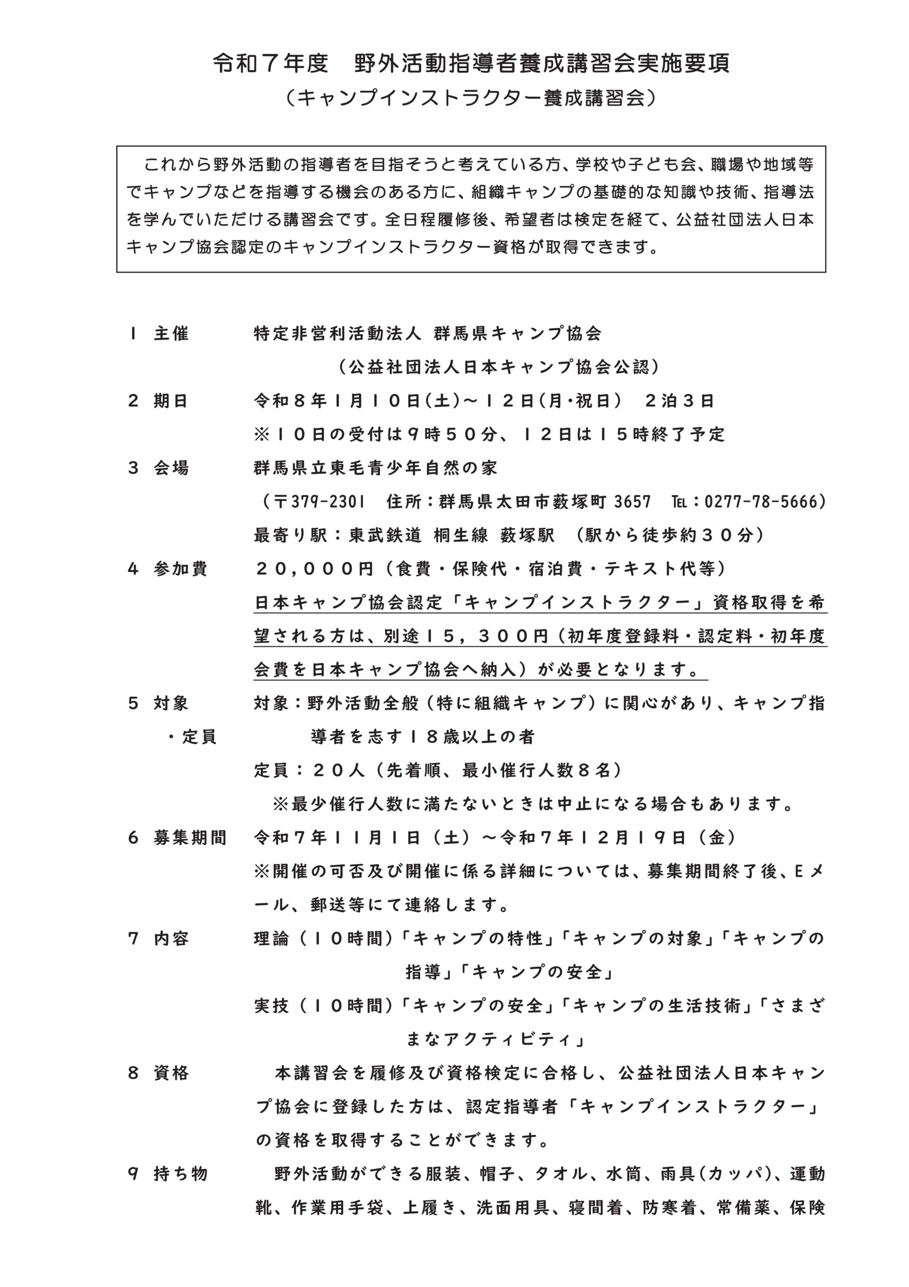 群馬:キャンプインストラクター養成講習会(1/10~12)
