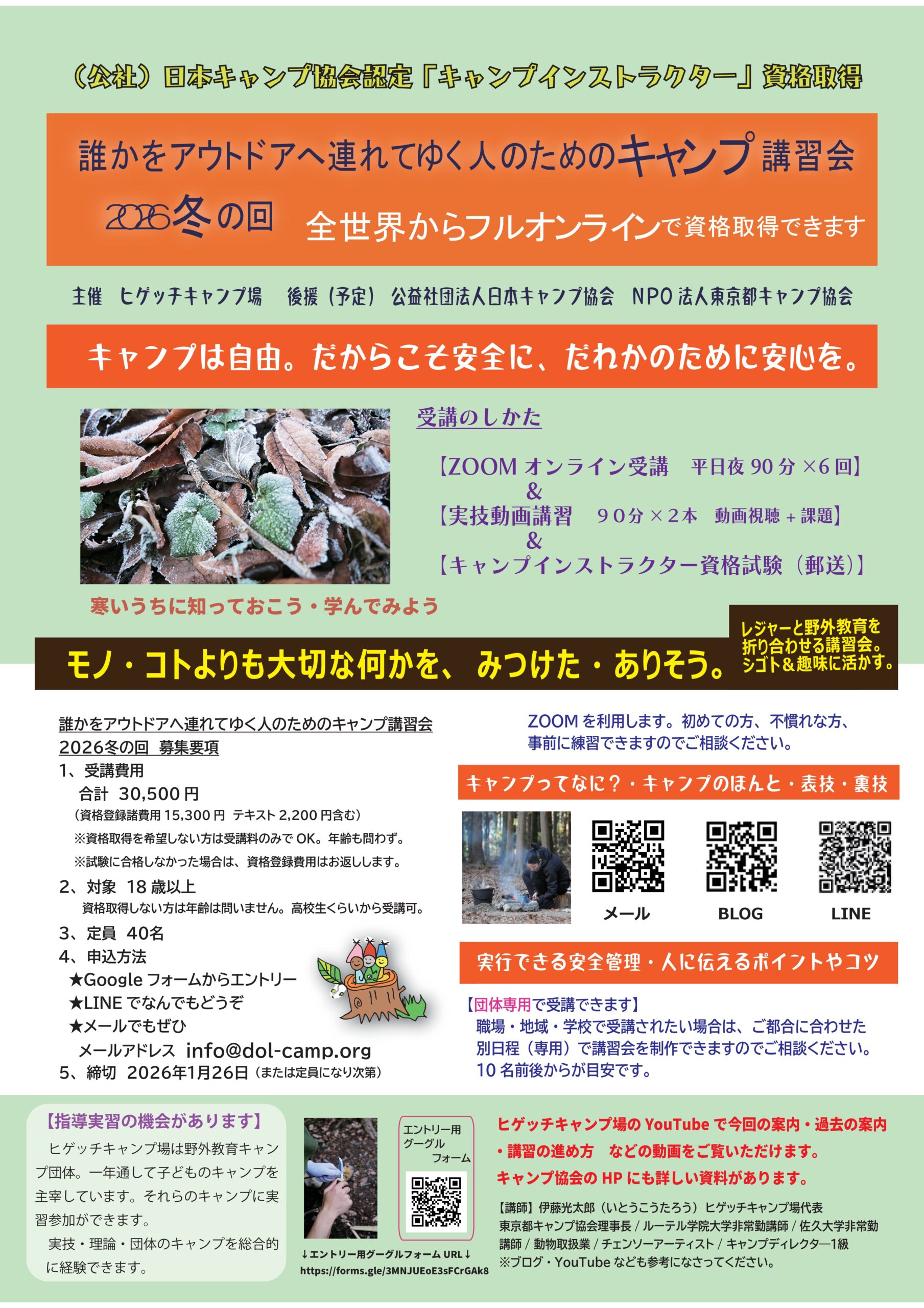 > オンライン・東京:キャンプインストラクター養成講習会(2/2・6・9・13・16・20)