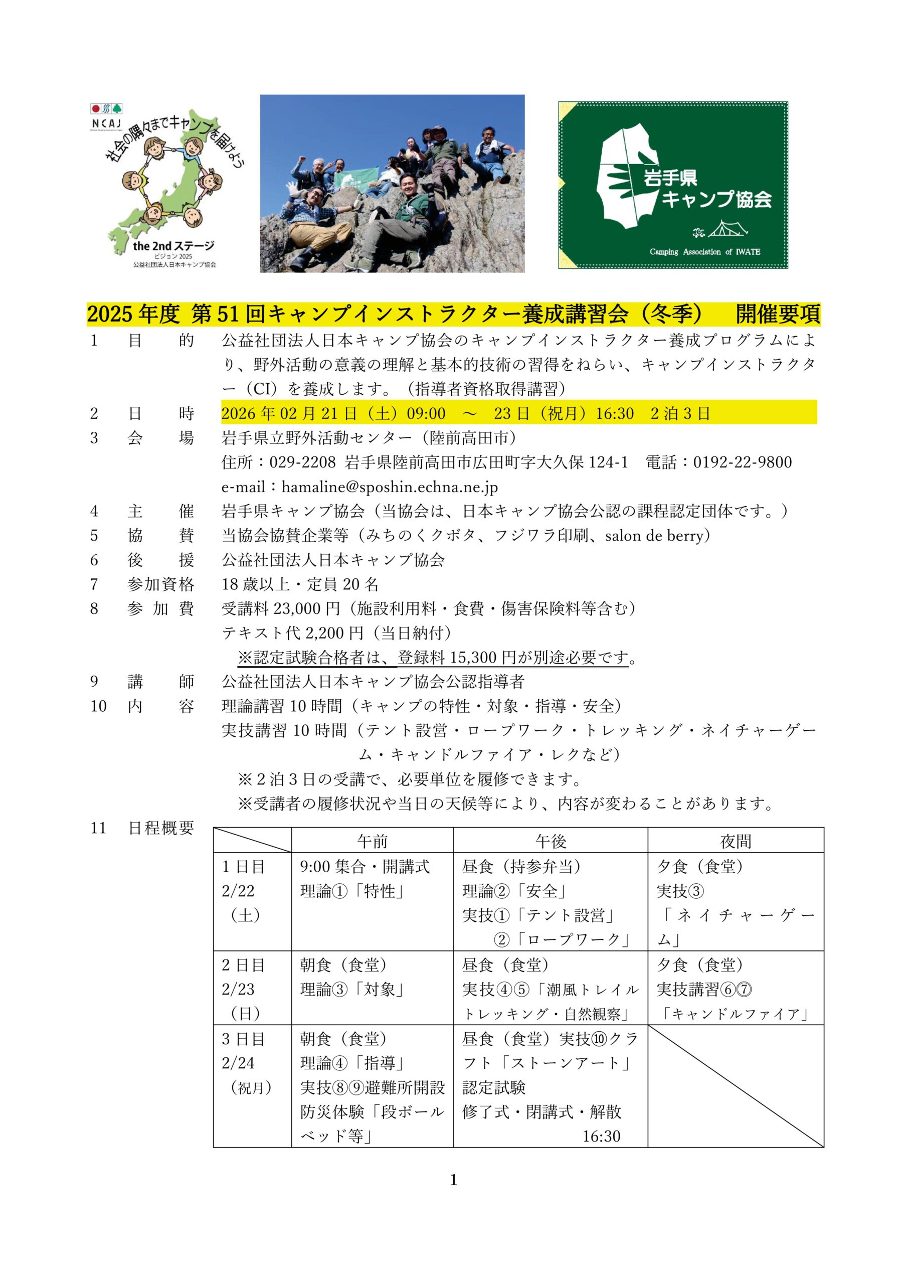 岩手:キャンプインストラクター養成講習会(2/21~23)