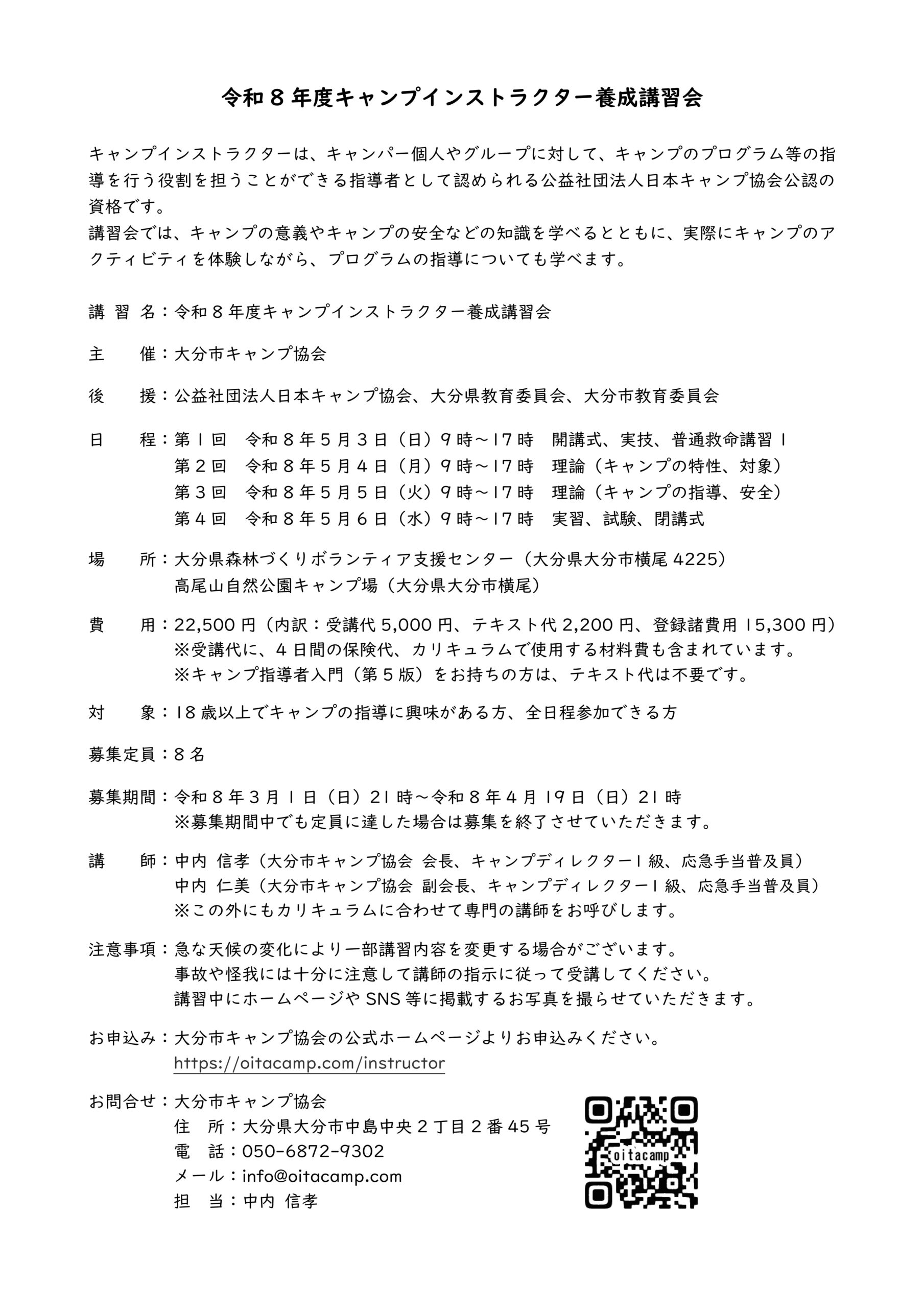 キャンプインストラクター養成講習会情報